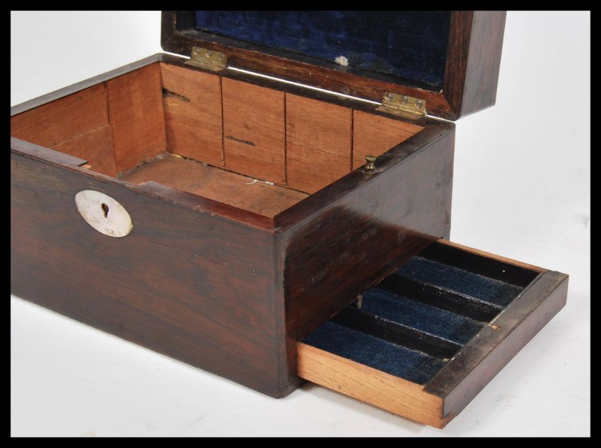 Two 19th Century rosewood boxes to include a jewellery box with mother of pearl panel and a smaller glove box with carved decoration. Highestmeasures 16 cm high x 25 cm wide x 19 cm deep.