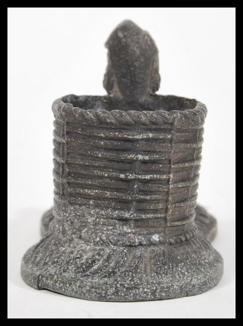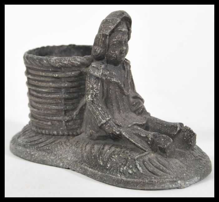 An early 20th Century white metal spelter figural match striker / strike  in the form of a Colonial gentlemen resting against a basket.