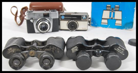 A pair of vintage binoculars to include lizars Clyde 8x30 and a Observer 8x30 together with two vintage film cameras Kodak instamatic camera and a Sillete I Agfa camera.