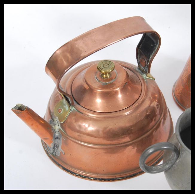 A collection of late 19th Century / early 20th Century pewter wares to include a lidded pitcher jug with reeded decoration and scrolled handle, two platters, two craftsmen pewter hammered goblets, a Manor commemorative Queen Elizabeth II dish etc. Together with a copper spirit kettle, a tapering lidded copper jug with a brass handle with Egyptian engravings and a bulbous form jug.