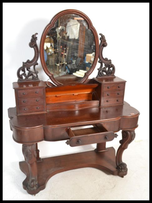 A 19th Century Victorian mahogany Duchess dressing table raised on scrolled legs with oval swing mirror flanked by twin trinket drawers. Measures 157 cm high x 116 cm wide x 50 cm deep.