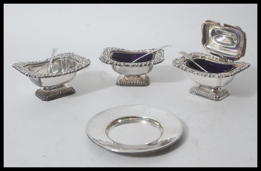 A silver plated rococo style table condiment set consisting of cruet set with two matching salts, one with blue glass liner and a matching lidded pot with handle. Three mustard spoons, two being silver hallmarked one of which is Georgian.