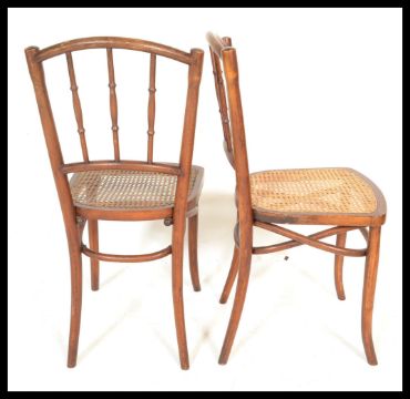 A pair of early 20th Century bentwood bedroom chairs in the manner of Thonet having bergere seats. Measures 89 cm high x 40 cm wide x 48 cm deep.