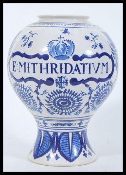 A large 18th Century Dutch style apothecary tin glazed earthenware jar having hand painted blue and white decoration depicting crowns and medallion borders. Notation reading E Mithridatium. Hand painted AH makers mark to base with artist signature. Tallest measures 31cm high 23cm diameter