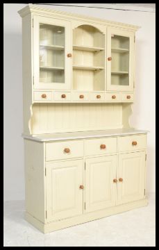 A Victorian style country painted pine kitchen dresser raised on large drawered base with glazed cupboard top. Finished in a white paint. Measures 220 cm high x 136 cm wide x 45 cm deep.