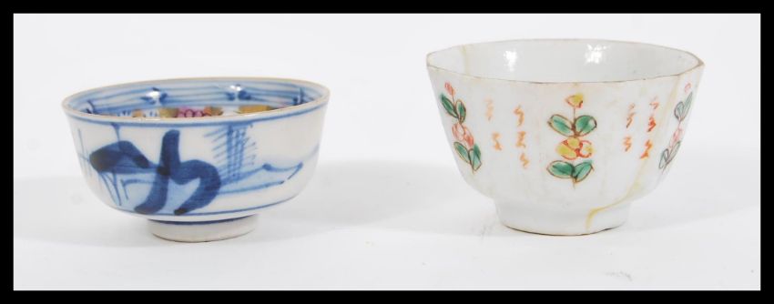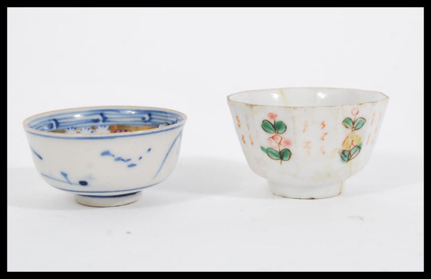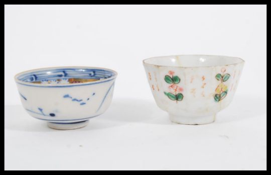 Two early 19th Century Chinese porcelain tea bowls comprising of an example having a blue and white exterior with good gilded and polychromed interior. The other having a white enamel ground with famille verte decoration. Largest measures 2.5cm high x 5.5cm width
