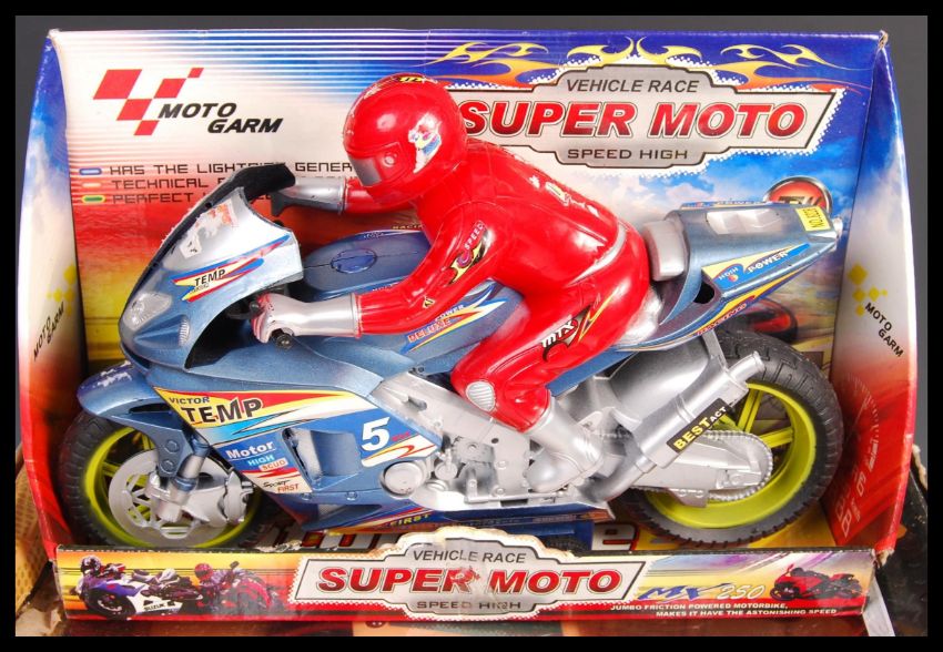 A Teamsterz made RC radio controlled Quatra off road vehicle within its original box along with MX250 Super Mot friction powered motorbike in the original packaging box.