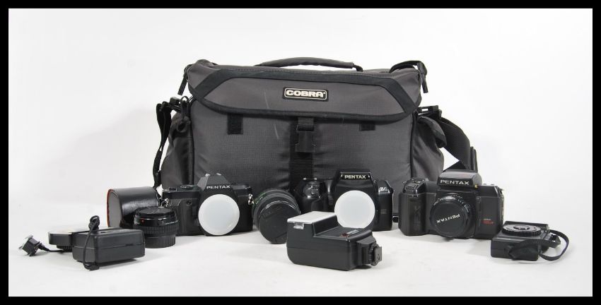A good collection of pentax cameras and accessories to include three Pentax cameras, lenses, flashes etc.