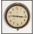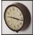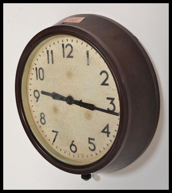 A vintage mid 20th Century industrial school wall clock having a round white face with arabic numerals to the chapter ring, set within a mottled brown plastic case. Measures 30 cm diameter x 8 cm deep.