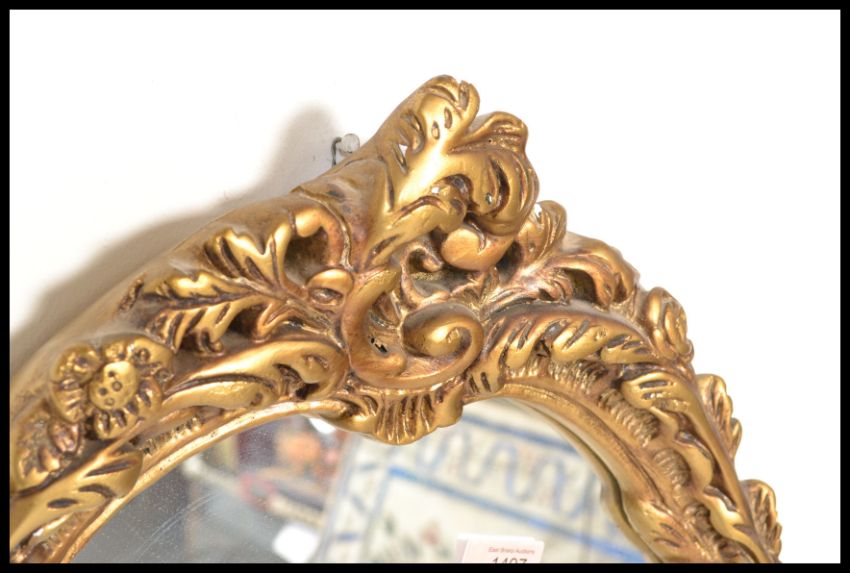 A group of three antique style gilt framed wall mirrors to include a matching pair with scrolled gilt frames and acanthus leaf decoration along with another similar example. Highest measures 68 cm x 37 cm.