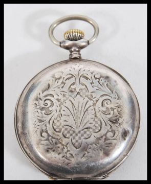 An early 20th Century Russian silver full hunter pocket watch having engraved decoration to the case with an unmarked armorial cartouche to the front and a white enamelled face with roman numerals to the chapter ring. Marked 84 to the case. Gross weight 77g. Measures 50 mm wide.
