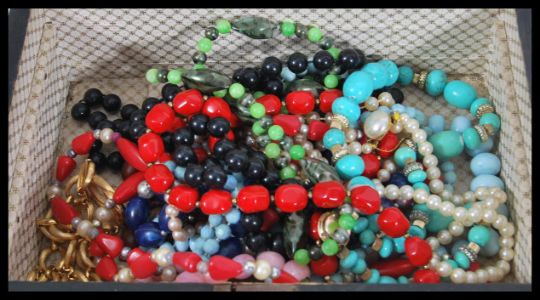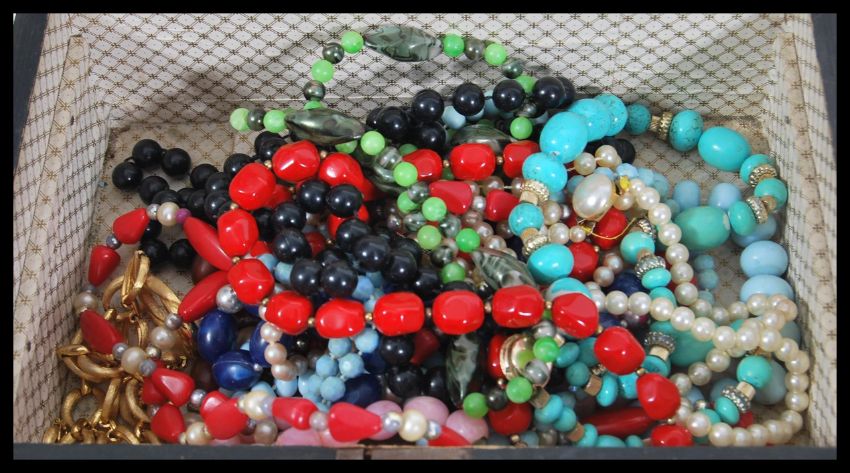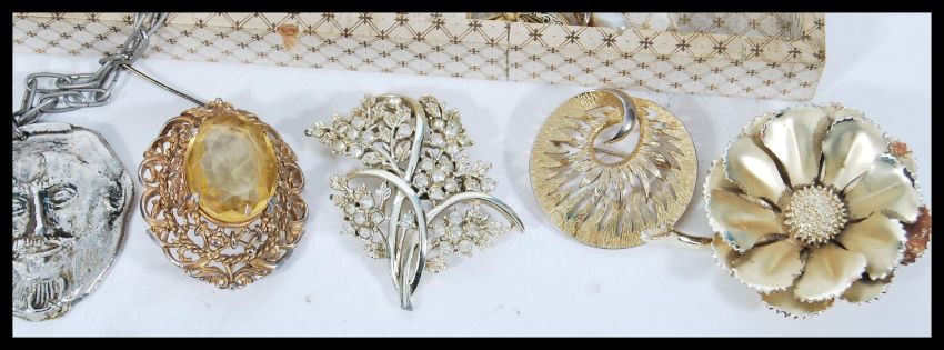 A collection of vintage costume jewellery to include a good collection brooches, a selection of beaded necklaces including simulation pearls, a yellow metal spacer bracelet set within a Tunbridge work box with inlaid geometric decoration.
