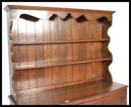 A 20th Century oak Welsh dresser, the plate rack with two fixed shelves, the base  having a central bank of three drawers flanked by cupboards raised on shaped supports united by stretchers. Measures 177 cm high x 125 cm wide x 47 cm deep.