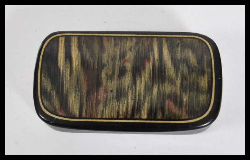 A 19th Century lacquered snuff pot of lozenge form, hinged painted lid with tortoiseshell finish.