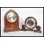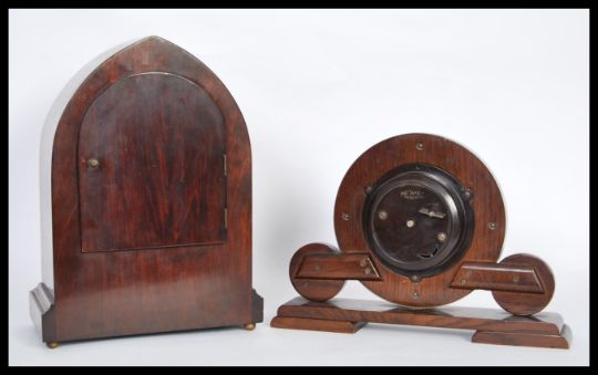 An early 20th Century Edwardian inlaid mahogany mantel clock of lancet form having a silvered dial with Arabic numerals to the chapter ring, along with an Art Deco 1930's Metamec Dereham oak mantel clock having a central round face with a silvered dial flanked by two other circular oak pieces raised on a stepped base. Highest measures 31 cm hgh x 23 cm wide.