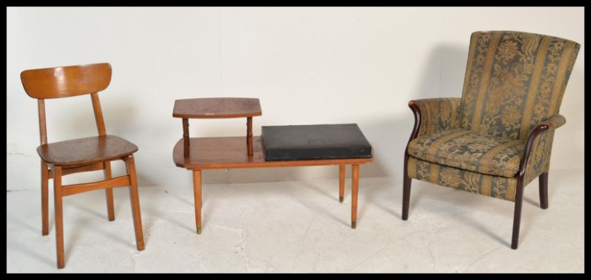 A retro 20th Century Parker Knoll armchair together with a retro teak wood telephone table and a single mid century beech dining chair. Measures 55 cm high x 90 cm wide x  40 cm deep.