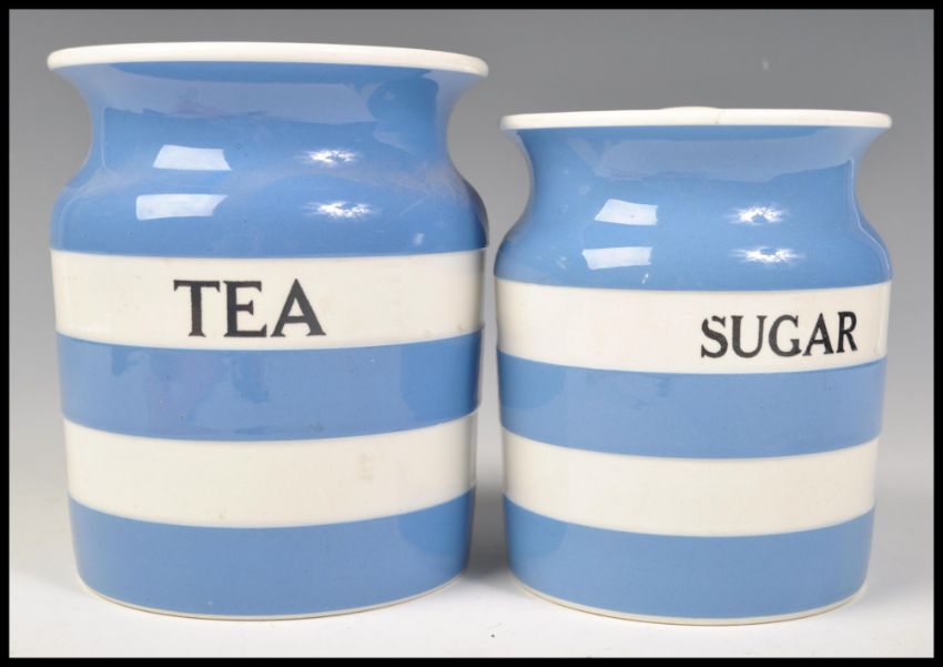 A pair of original early 20th Century TG Green Cornishware Cornish Kitchen Ware storage jars for tea and sugar having blue and white bands with bold notation to fronts. Complete with lids and stamped to bases.