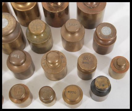 A large collection of antique brass and bronze weights dating from the 19th Century of various form and sizes to include apothecary and gold measuring weights.