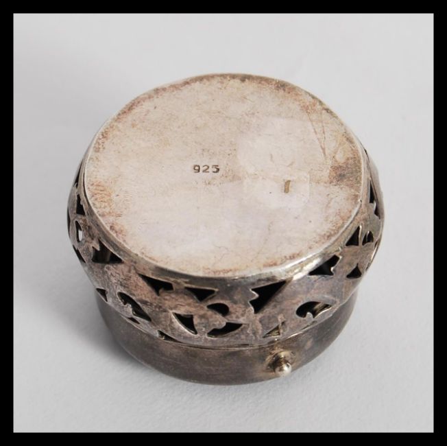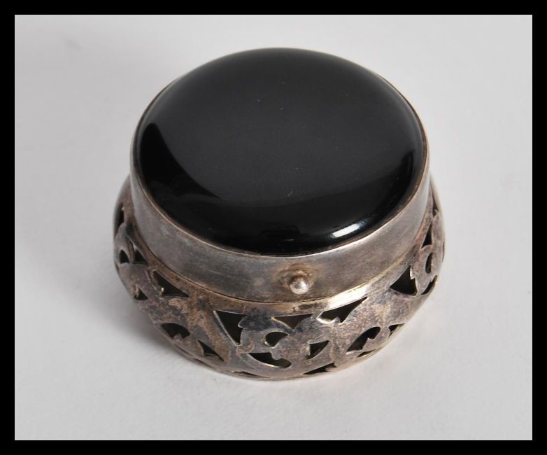 A 20th Century sterling silver 925 pill box of large bulbous form having pierced decoration with large onyx cabochon lid. Stamped 925 to base. Weighs 31.6 grams. Measures 2cm high x 4cm diameter.