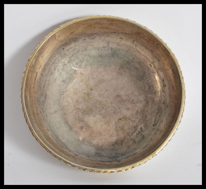 A sterling silver 925 stamped centerpiece bowl raised on an embossed gilded foot with decorative gadrooned border. Weighs 213 grams. Measures 5cm high x 13.5cm diameter.