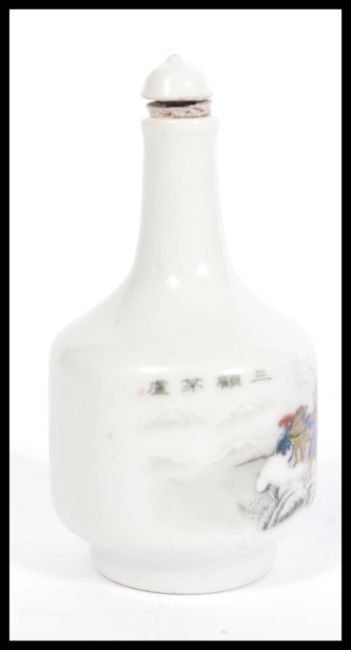 A 20th Century Chinese snuff / white ceramic scent bottle with a printed winter scene to the side, having character marks to the base and lid to the top. Measures 9cm high.