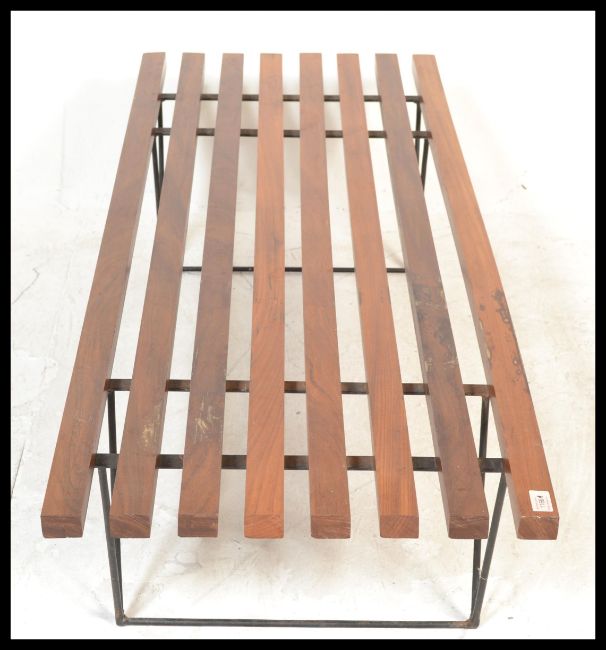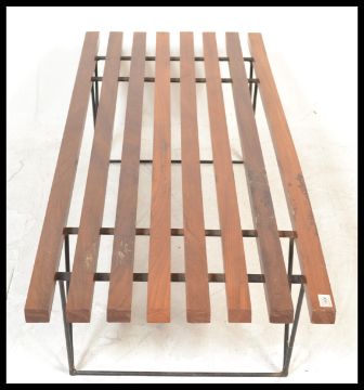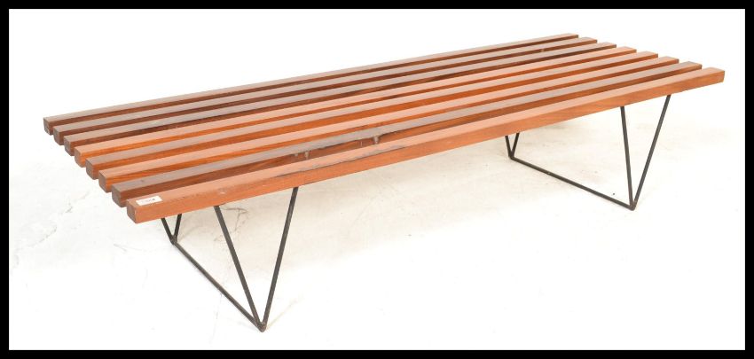 A vintage 20th Century Robin Day Hille For Day Bench lido style slatted bench of good proportions raised on ebonised hair pin supports. Measures 33 cm high.