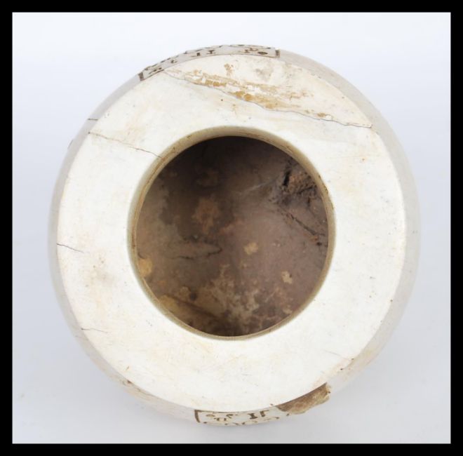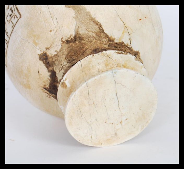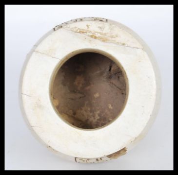 A 20th Century Egyptian revival Old Kingdom style tomb jar, made from a ceramic imitation of ivory, of bulbous form raised on a round foot having a cartouche of hieroglyphics to the front and back and some bandage wrappings to the neck and foot.