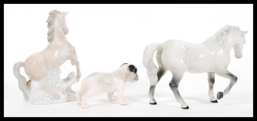 A collection of 20th century ceramic figurines to include a white Beswick horse having mottled grey colouration along with an unmarked figurine of a bulldog and a John Buck unicorn figurine.