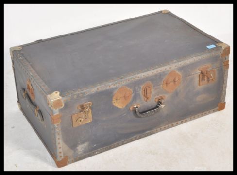 A vintage 20th century steamer trunk, hinged lid studded detail finish and in the original blue. Measures 33 cm high x 85 cm wide x 51 cm deep.