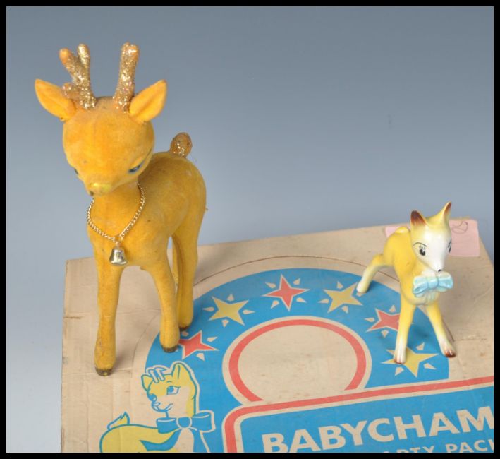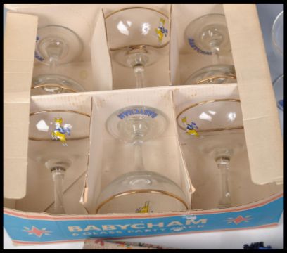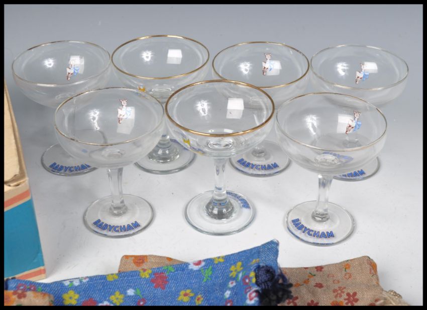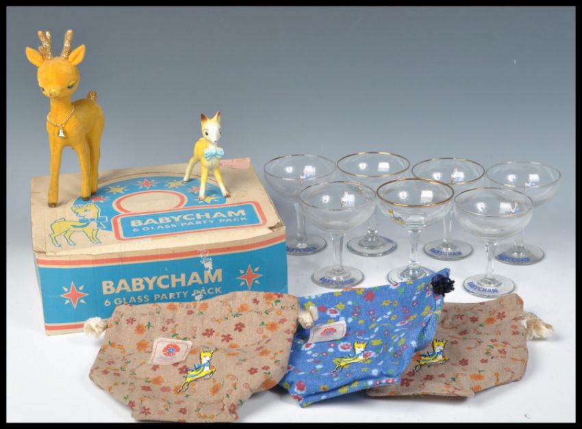 A collection of vintage retro 20th Century Babycham advertising items to include a boxed set of six Babycham glasses, rair make up bags x3, felt and ceramic Babycham fawn, and various other Babycham glasses x 7.