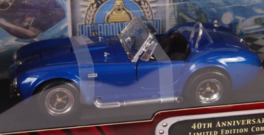 A collection of 3x Road Signature 1:18 scale precision diecast models - all Cobras - to include; 1964 Shelby Cobra (one red, one silver) and a ' 40th Anniversary Limited Edition ' Cobra in blue. All appear as new, and mint, within the original display boxes.