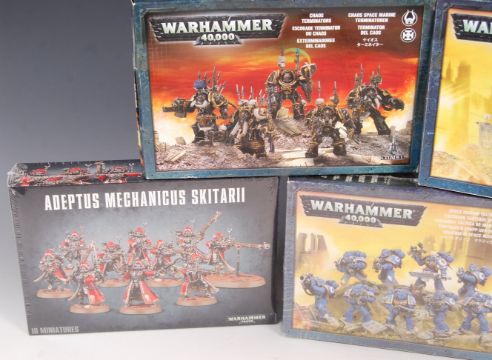 A collection of 5x Citadel / Games Workshop ' Warhammer 40,000 ' war gaming figure sets. To include; Chaos Terminators, Space Marine Tactical Squad (sealed), Adeptus Mechanicus Skitarii, Space Marine Venerable Dreadnought, and Chaos Space Marines Squad. All appear complete and are either factory sealed or contents unused. Good collection.