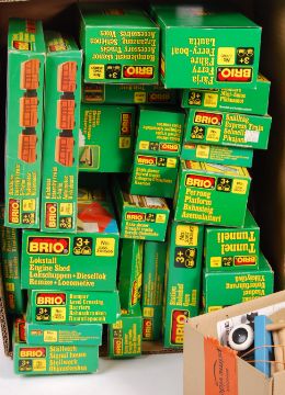 A large collection of assorted vintage Brio wooden trains and trainset items. All within the original boxes, to include various boxed sets, track sections, buildings, different types of train and many other elements. Box numbers include; 3313, 3320, 3366, 33362, 3351, 33568, 3367, 3359, 3346, 3371 and others. All presumed (and appear) complete, but unchecked by us.