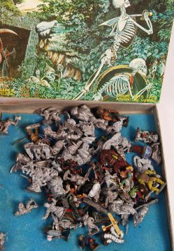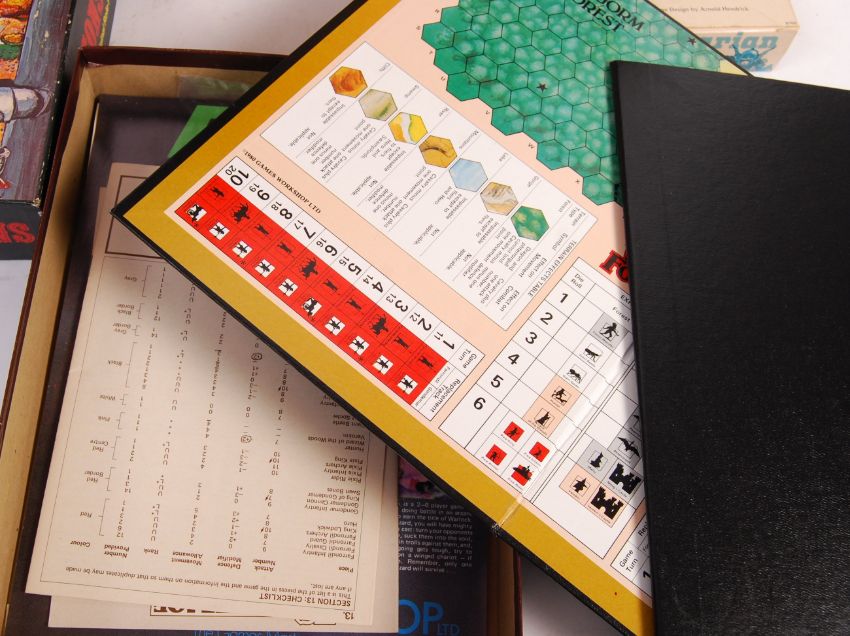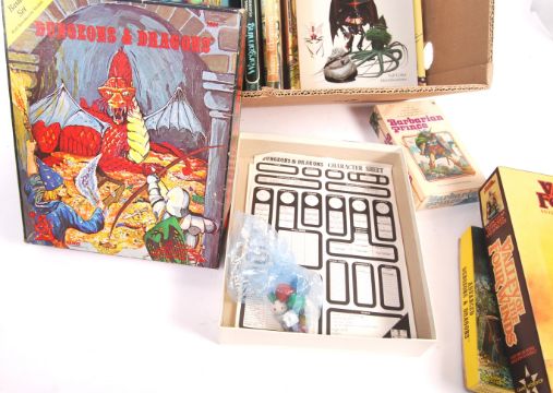 A good large collection of assorted vintage Dungeons & Dragons / Fantasy War Gaming boxed sets and books / manuals. To include books: Advanced D&D (Monster Manual, Deities & Demigods, Fiend Folio etc), Runequest, White Dwarf, The Book Of Treasure Maps, Dungeon Master's Guide. Along with some boxed sets (contents unchecked, but do not appear complete) - Valley Of The Four Winds, Barbarian Prince, and others. Along with some boxed Citadel Miniatures Runequest figures and other associated items.
