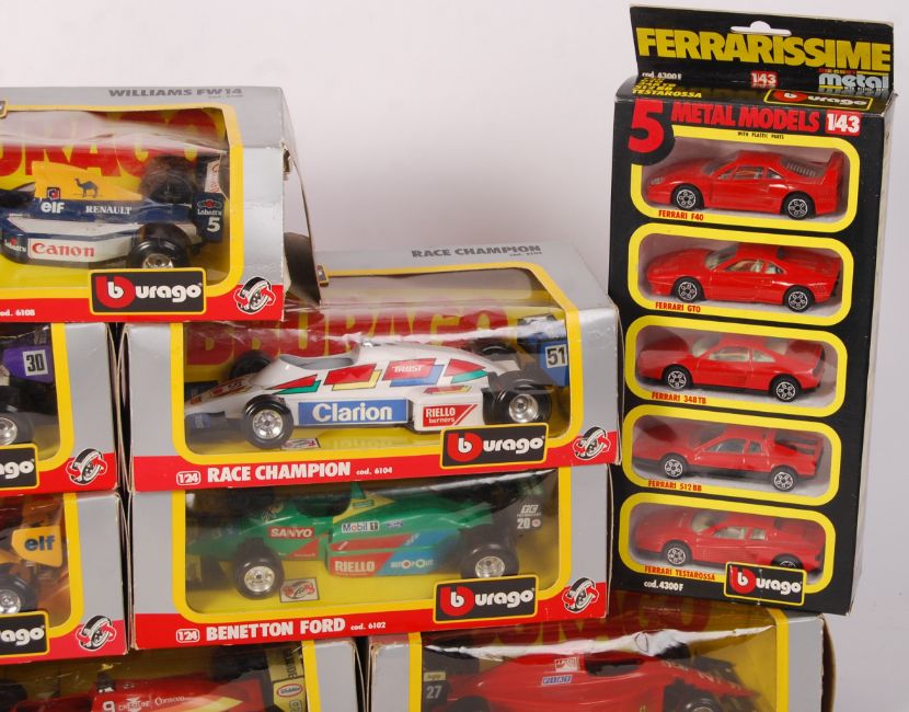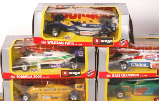 A collection of 8x Bburago / Burago made 1:24 scale precision diecast model cars - all boxed. All Formula 1 racing cars. Along with a boxed Burago 4300F ' 5 Metal Models ' collectors set.