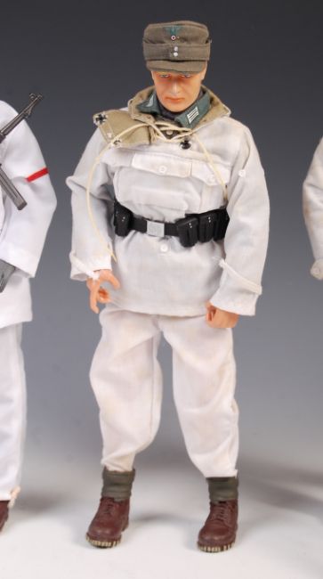 1/6 Scale Collection - a collection of 3x Dragon made 1:6 scale WWII Second World War Nazi / German ' Snow Trooper ' scale action figures. All unboxed, all with uniforms and various accessories. A set of skis and poles present. Well detailed models. Note: from an impressive large 1/6 scale military action figure collection including DiD Corp, Dragon, Hot Toys, 3Reich, and others. Whilst several figures are mint and unused, the majority of the collection comes from items that have been on display. Whilst condition of all these items is generally mint, some may show signs of display use. East Bristol Auctions does not guarantee the contents or completeness of any boxed or loose figure, and buyers are reminded to satisfy themselves as to condition / completeness prior to bidding on any lot, irrespective of description.