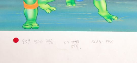 A rare  original piece of artwork produced by CLIC (The Character Licensing Illustration Company) in the 1990's for Mirage / Grandreams productions - the company responsible for all Teenage Mutant Hero / Ninja Turtles annuals, colouring books and other literature. This piece appearing to be for the Colouring & Story Book. Depicts all four Turtles exiting a sewer pipe. Mixed media - watercolour, ink and acrylic on paper.Along with a printer's mock-up copy of the artwork and text overlays, and the original acetate and card overlays. Most with annotation to margins. Artwork size approx: 31cm x 24cm.From the same collection as the rest of the artwork (we sold back in 2015), this one having only just been re-discovered by the vendor when clearing out a storage unit.