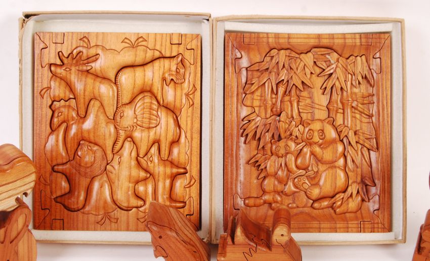 A Chester Wedgewood's handmade wooden carved jigsaw puzzles to include; Panda Jigsaw, Jungle Jigsaw and a collection of 9x lidded animal and fruit shaped pots. Largest measures; 22cm x 18cm.