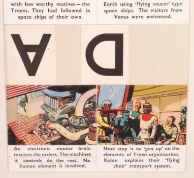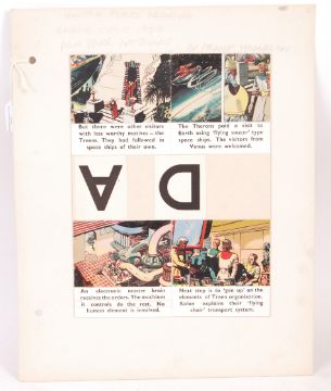 A rare 1950's Eagle Comic ' Dan Dare ' storyboard annual artwork panel by Frank Hampson. Featuring over-coloured prints and captions pasted on to a printers board, inscribed in pencil and dated 1950. Used for the production of cineslides.  Ex Hulton Press Archive, approx; 41cm x 33cm