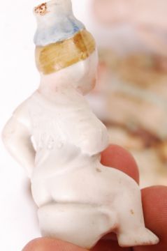 A collection of assorted 19th century German / French bisque porcelain miniature dolls to include; 3x children in dress, a baby with mould marks and a novelty boy sat on a potty numbered 503. Measures: 12cm.