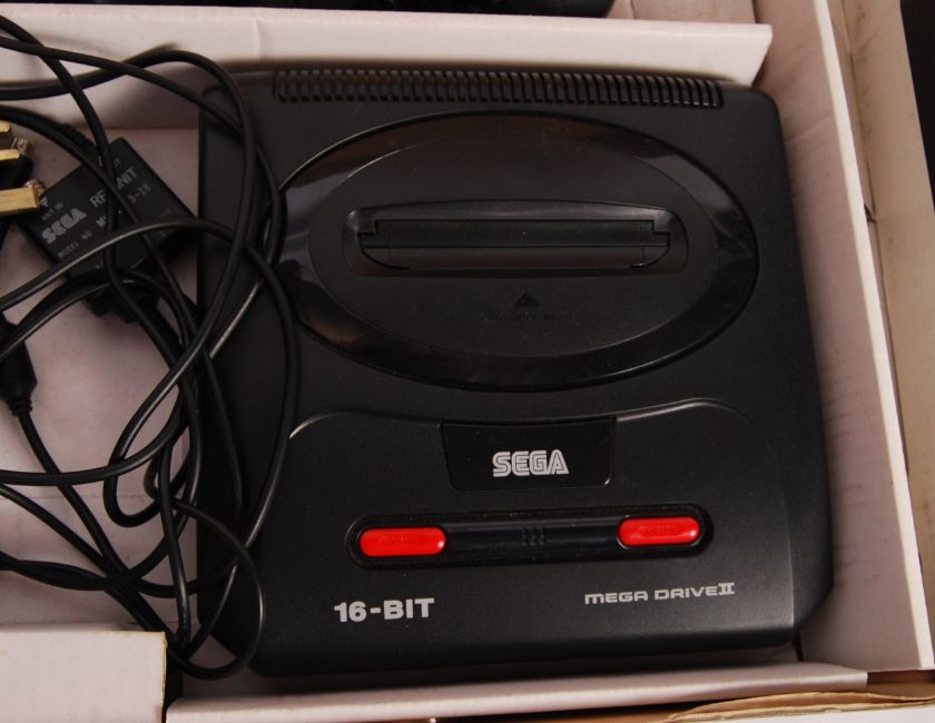 An original vintage Sega ' Mega Drive II ' 16 Bit games console. Appears complete with both controllers, power lead and TV cable. Within it's original slimline box.