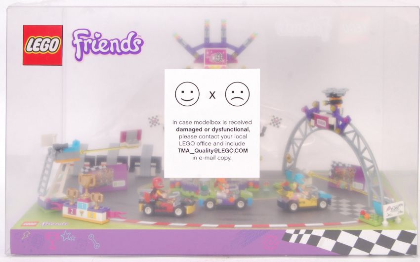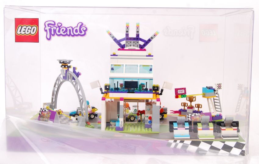 A Lego point of sale shop display advertising cabinet for Lego Friends series. Featuring set 41352 The Big Race Day. Fully made and assembled for display. The cabinet never been on display and still within its original trade box. Measures approx; 30cm x 50cm x 30cm.