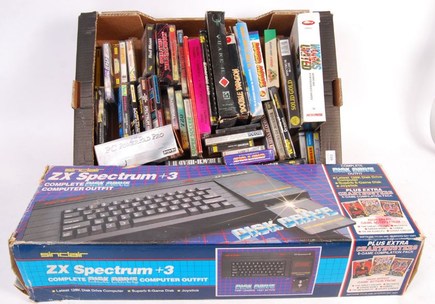 An original vintage ZX Spectrum +3 games console, within the original box. Along with a large quantity of Spectrum game cassettes, and a few other console related games - including Quake II, Back to The Future, Danger Mouse, Double Dragon and others. Good large assorted collection.
