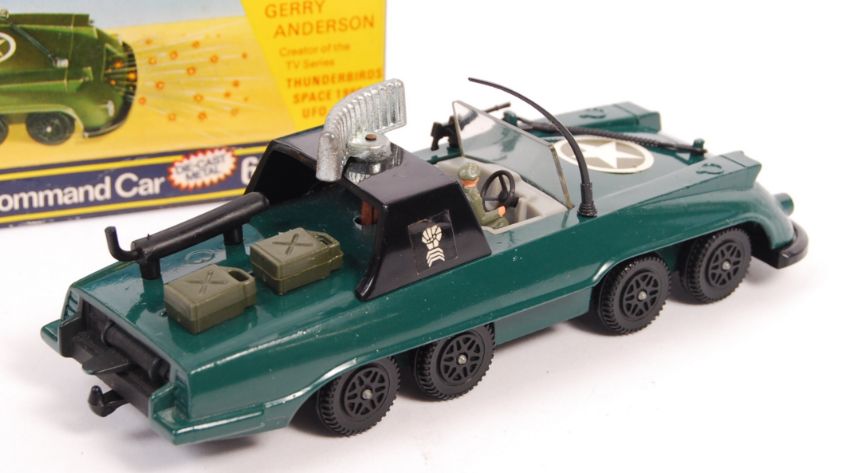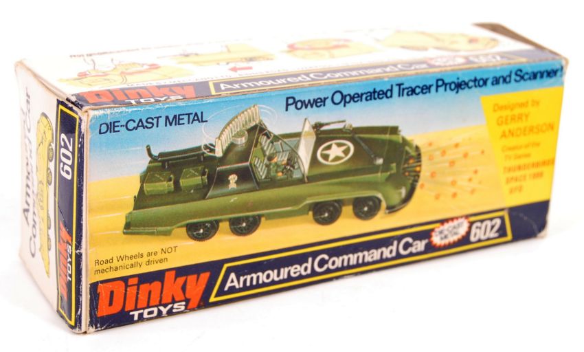 An original vintage Dinky Toys diecast model No. 602 Gerry Anderson designed ' Armoured Command Car .' Amazing mint condition model, with a good sparking action. Within it's original box. Rare in such condition.