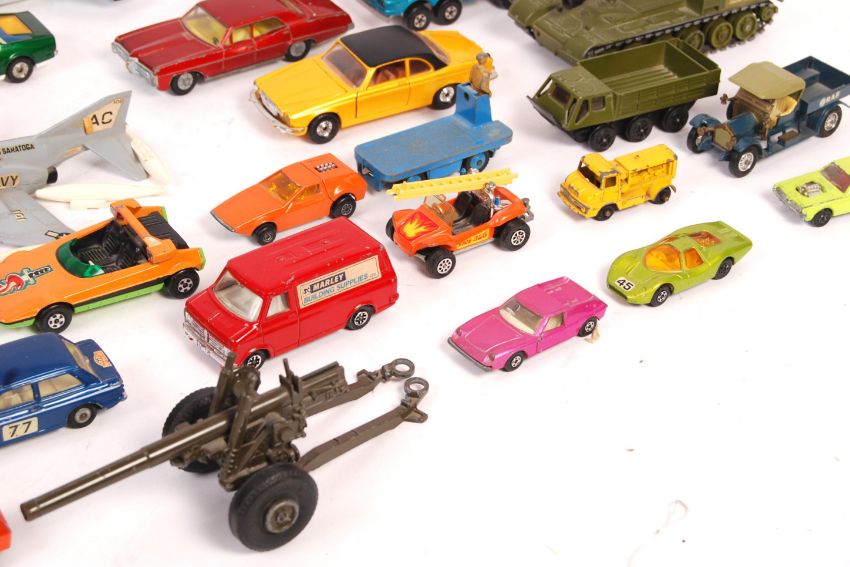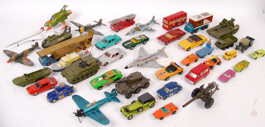 A good collection of assorted vintage unboxed diecast models. To include; Dinky Toys model planes, Concorde, Dinky Toys tanks and military vehicles, Dinky SHADO model from UFO, some Matchbox and others. Great selection.