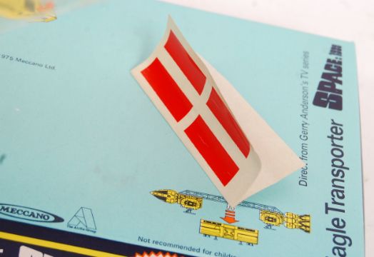 An original vintage Dinky Toys made ' Gerry Anderson's Space 1999 ' ' Eagle Transporter ' diecast model No. 359. Model appears near mint (some light paint chips, and discolouring to the white plastic). Within it's original flat-type display box. Box appears near mint - no cracks to the top plastic, but some splits to edge corners. Unused transfer sheet included. Great vintage diecast model.