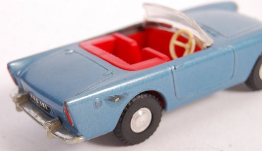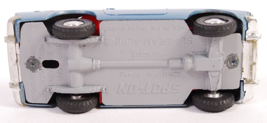 A rare variation / rare colour Triang Spot On 1:42 scale diecast model Sunbeam Alpine. Rarer metallic blue body, with red interior and white steering wheel. Very near mint model (just one paint blemish near fuel filler cap). Number plate decals and windscreen present. Rare.