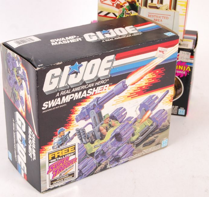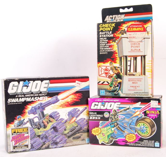 A collection of 3x Hasbro made GI Joe / Action Force boxed action figure playsets. Comprising: vintage Action Force ' Check Point ', GI Joe ' Ninja Lightning ', and ' Swamp Masher ' (factory sealed). All believed complete, within the original boxes.
