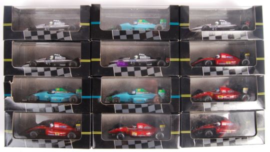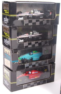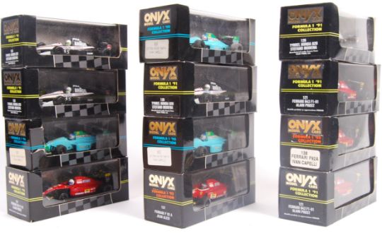 A collection of 12x Onyx made 1:43 scale precision boxed diecast model racing cards. All ' Formula 1 ' collection. Each appears mint, within the original display boxes. Highly detailed models.