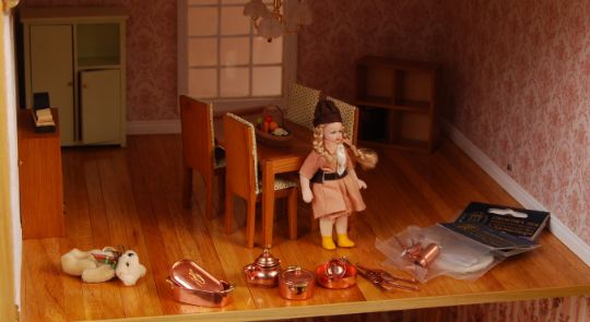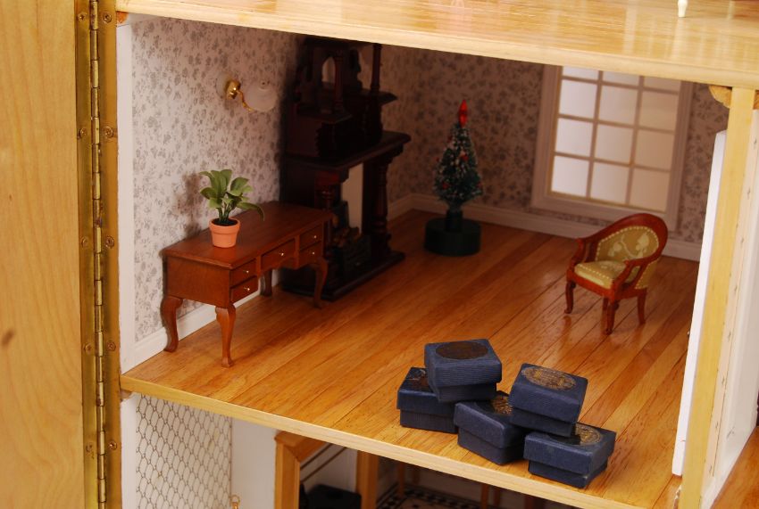 A beautiful contemporary Georgian style mansion house dolls house. Three storey (including attic), with twin opening doors and roof to top. Large windows, with chimneys to the faux-tiled sloping roof. Seven rooms, with two hallways. Comes fully furnished and decorated (see images). Electric lights and fireplaces fitted (untested). Very well made and an impressive example of a dolls house mansion. Measures: H78cm x W93cm x  D40cm.WORLDWIDE DELIVERY AVAILABLE - please click the 'shipping' tab and view rates for ' Furniture Delivery '.